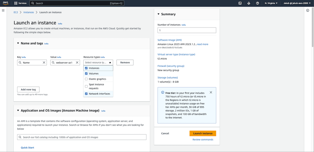 In the Name and tags section at the top, click on Add additional tags and pass some descriptive name as the value. Check the boxes for Instances, Volumes, and Network interfaces for Resource types. Move to the Application and OS Images section. Select Amazon Linux 2023 AMI as the Amazon Machine Image. Further down, set the Instance type to t2.micro. In the Key pair section, click on Create new key pair and give it a name.