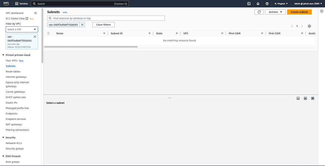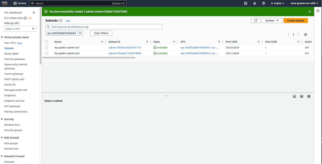 Next, we are going to create two public subnets in our VPC for high availability. To get started, select Subnets and make sure to filter the VPC and select our VPC to ensure that no other subnets are listed. Then click on Create subnet. On the next screen, select your VPC, provide a name, choose the availability zone, and enter the IPv4 CIDR. Scroll down and click on Create subnet. After this, we need to create a second subnet in a different availability zone to ensure high availability for our website.