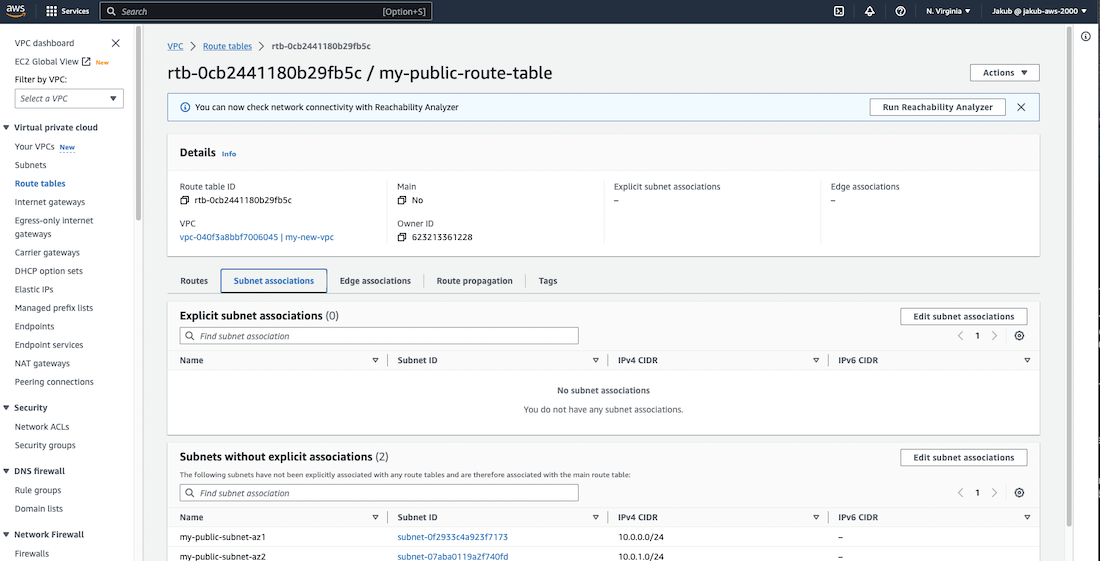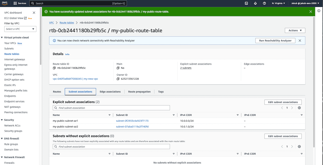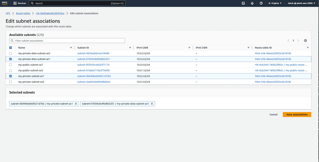 Now we have to associate our public route table with our subnets. To do this, select the public route table, click on Subnet associations, and then click on Edit subnet associations. On the next screen, select the two public subnets and confirm by clicking on Save associations.