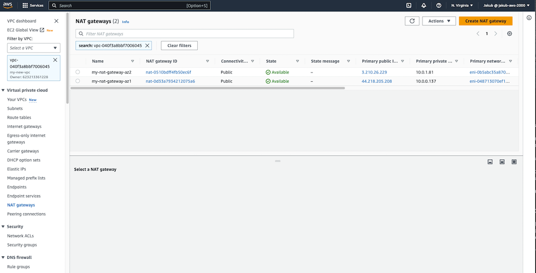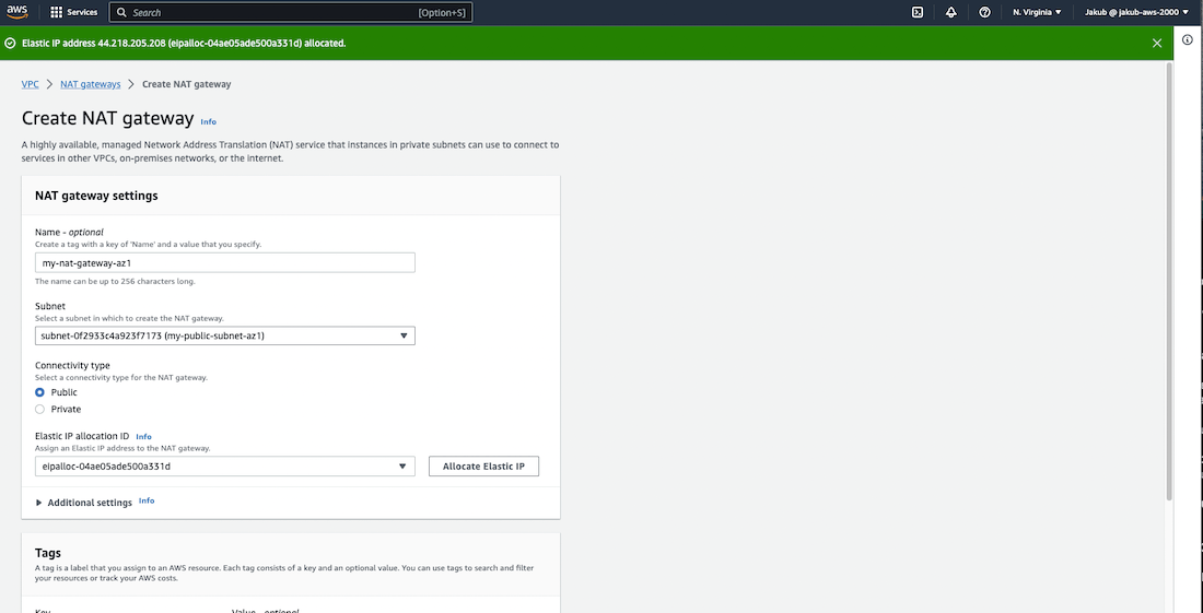 To create NAT Gateways, select Nat gateways on the left-side menu, click on Create NAT gateway, pass the name, select public subnet in AZ1, and click on the Allocate Elastic IP button to assign an elastic IP. Click on Create NAT gateway and repeat the steps to create a second NAT gateway, changing the name and subnet to our public subnet in AZ2. Check the screenshot for reference.