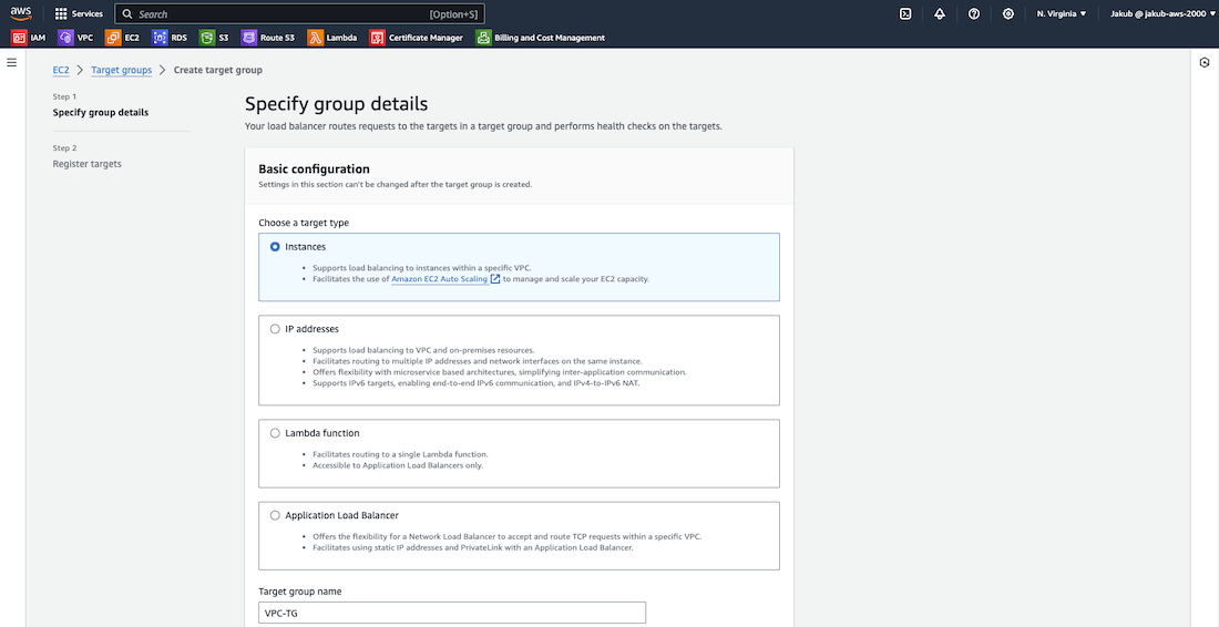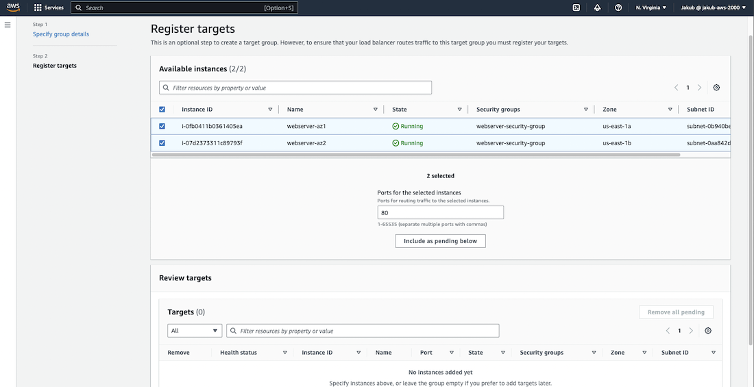 Moving on to the Listeners and routing section, click on Create target group for HTTP. On the following page, ensure that you have chosen Instances as the target type to route traffic to our EC2 instances. Enter a name and select our VPC. Then, click on Next, in the next step select our instances as targets, and click on Include as pending below button. Finally, click on Create target group at the bottom of the page.