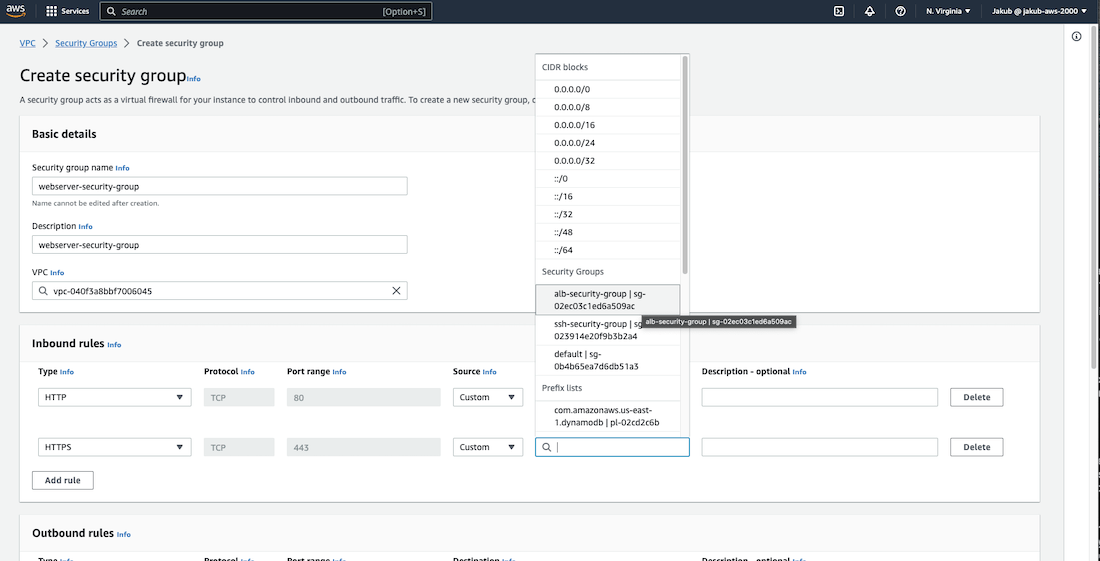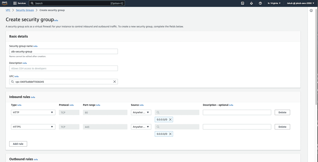 First one will be ALB security group. To do this, navigate to the VPC dashboard and select Security Groups from the left menu. Click on the Create Security Group button and provide a name, description, and select our VPC. In the Inbound Rules section, click on Add Rule and select HTTP as the Type, which always uses Port 80. For Source, enter the IP address 0.0.0.0/0 so basically all IPv4 addresses. Next, add a second rule for HTTPS on Port 443 and the same Source address. Then, scroll down and click on Create Security Group.