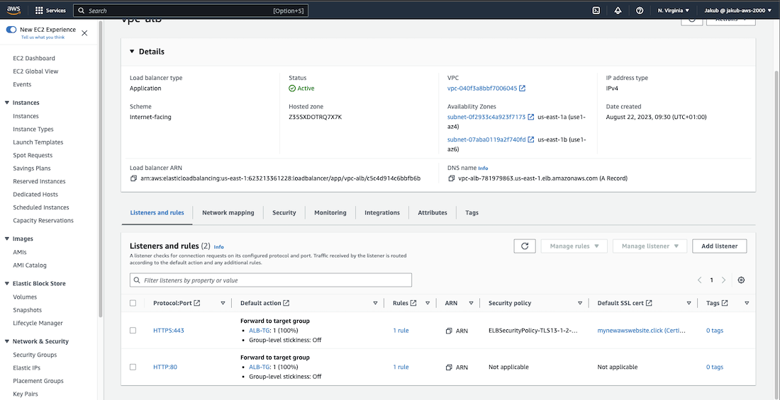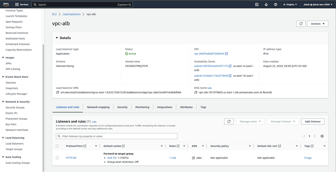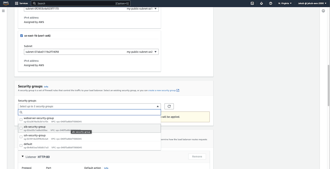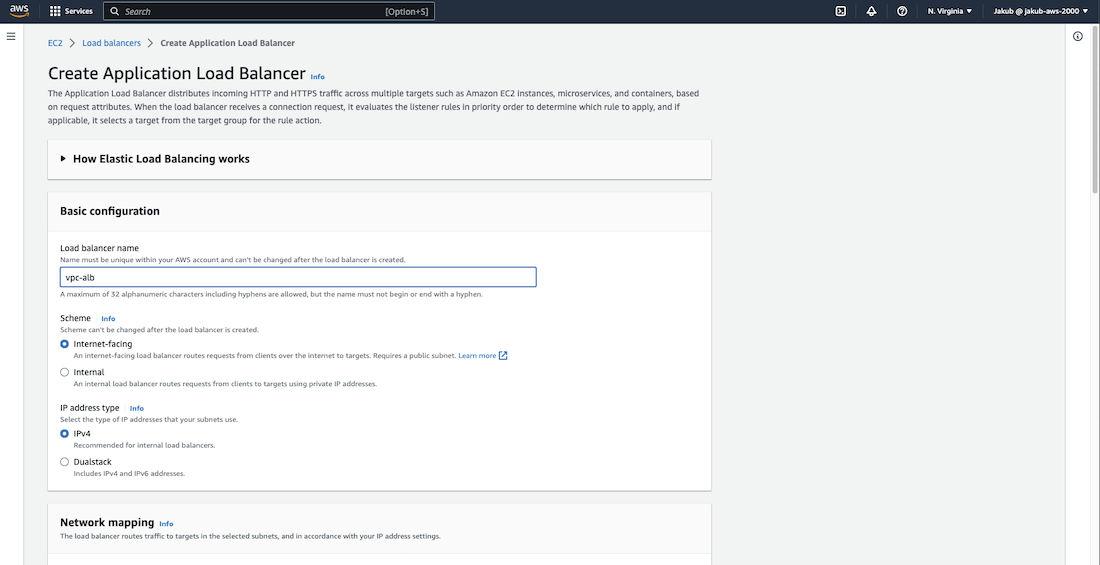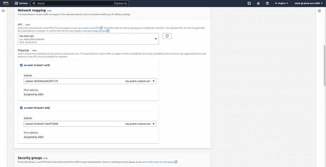 Pass the name and in the Network mapping section, choose our VPC and select the public subnet in AZ1 and the public subnet in AZ2 respectively for the availability zones. For the Security groups field, select our ALB security group.
