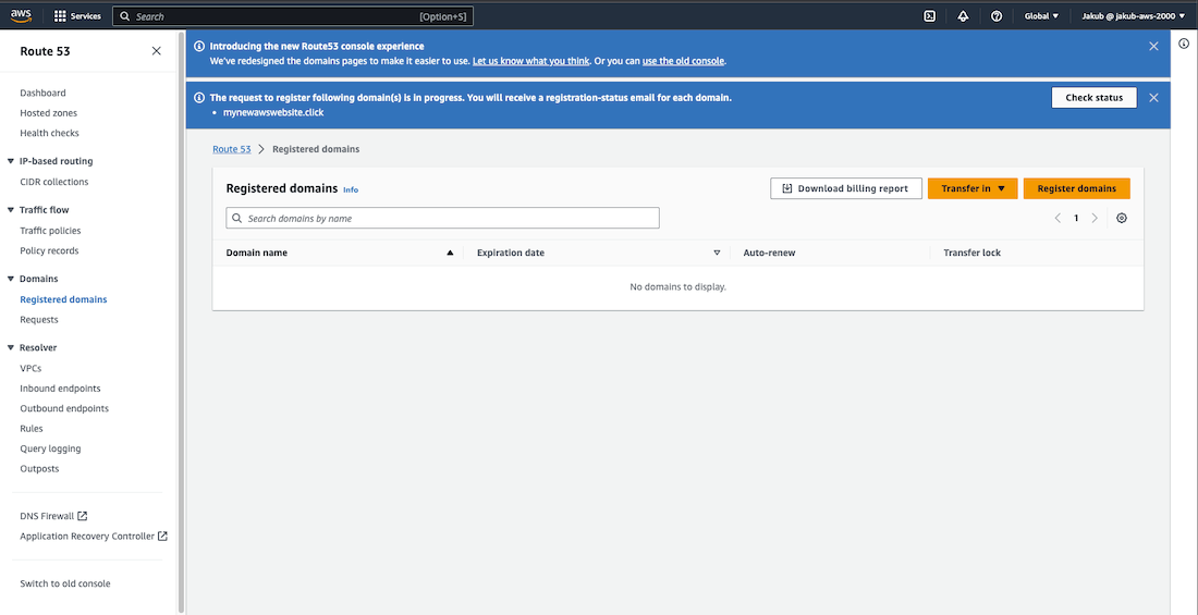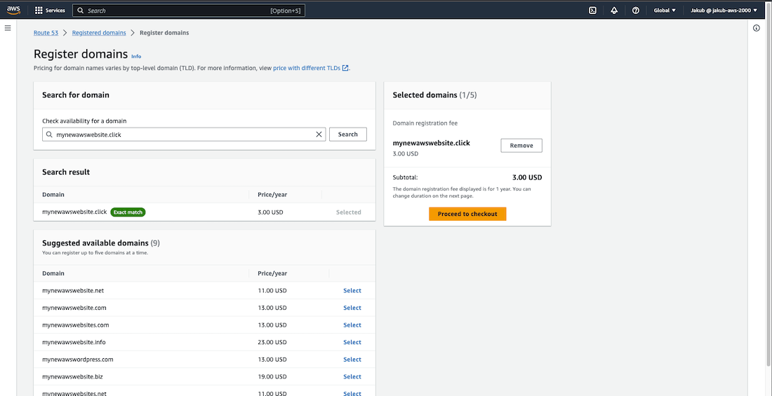 in the search bar and select it from the list. On the next page, in the Register domain section, enter the domain name you would like to have and click on the Check button to check its availability. If it's available, click Select next to the domain you'd like to buy, then click Proceed to checkout. On the next page, click Next and enter your Registrant contact details. Click Next at the bottom, then review your details on the Review and submit page. Check the terms and conditions, then click Submit. On the next page, click Check status to confirm that your domain is ready. It may take up to 15 minutes for your domain to be ready.