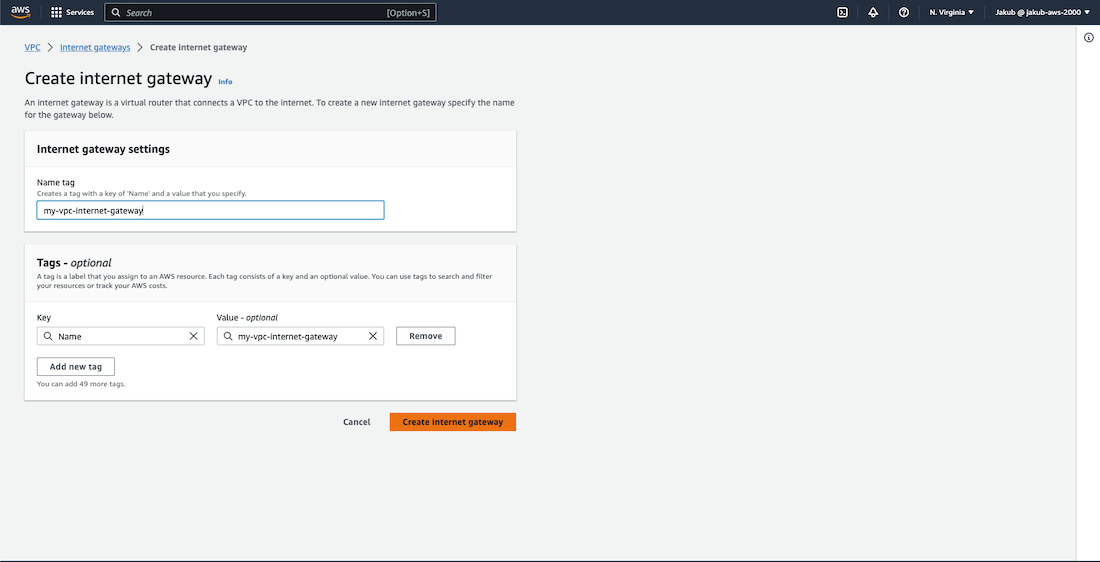 To enable communication with the internet, we need to create an Internet Gateway and attach it to our VPC. To get started, click on Internet Gateways from the left-hand menu and then select Create Internet gateway. On the next page, provide a name and click on Create Internet Gateway to complete the process.