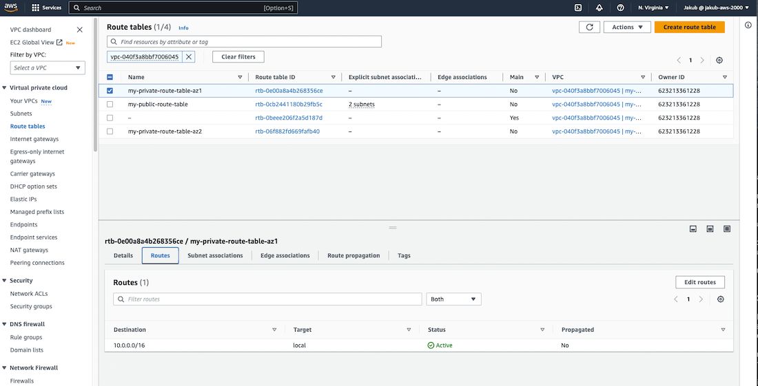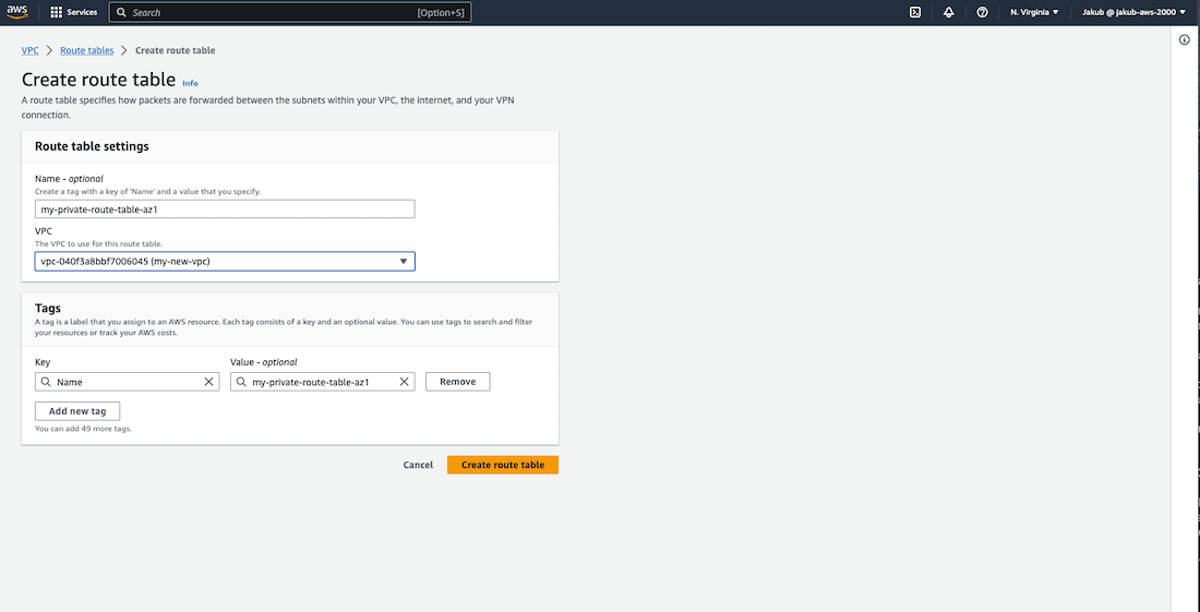 Now we need to create explicit route tables for our private subnets, which would direct traffic to Nat Gateways so that instances in our private subnets can access the internet through the Internet Gateway. To do this, follow the same steps used to create the first route table, but with a different name. Once that is done, repeat the process for the second private route table.