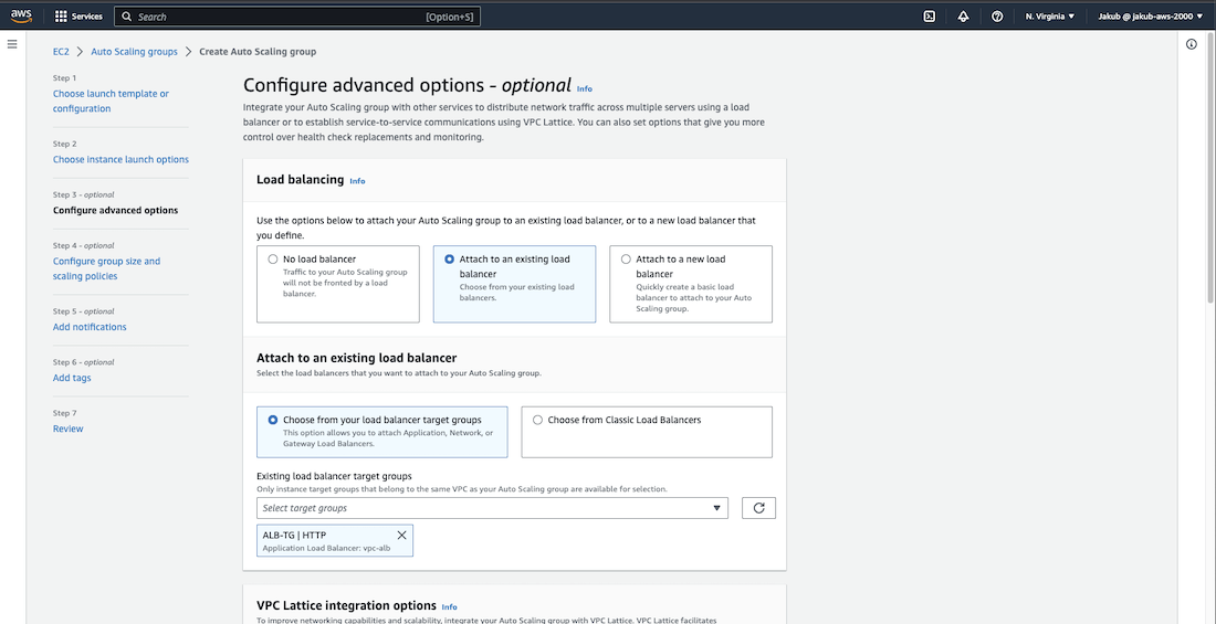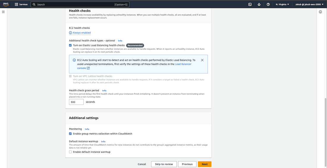 Under Attach to an existing load balancer, select our ALB target group from the list. In the Health checks section, check the Turn on Elastic Load Balancing health checks option. Under Additional settings, check the Enable group metrics collection within CloudWatch option.