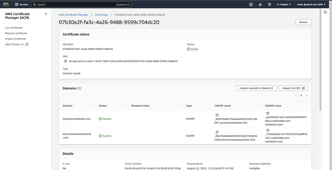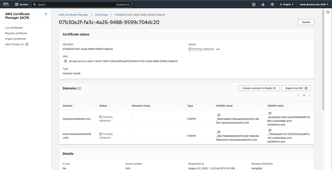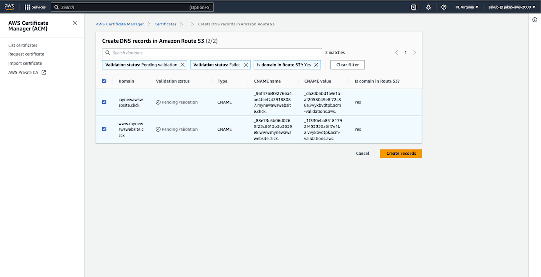 After this, on the Certificates page, click on the View certificate button and then click Create records in Route 53 to complete the validation of the certificate. On the next page, ensure that your domains are selected and click Create records. Once you refresh the webpage, you should see that the status for your certificate is Issued.
