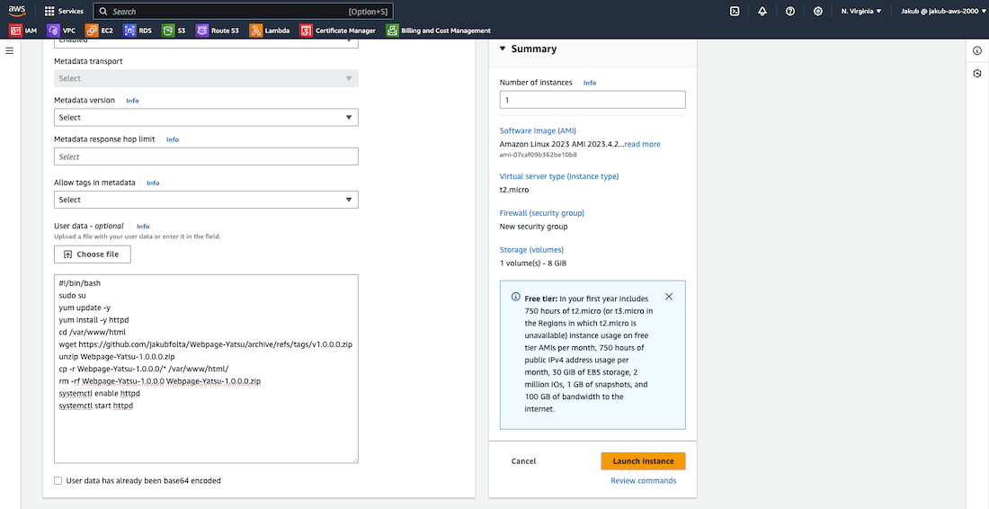 Now scroll down to the Advanced details section, click on it, and scroll all the way down. In the User data field, paste the following bash script: