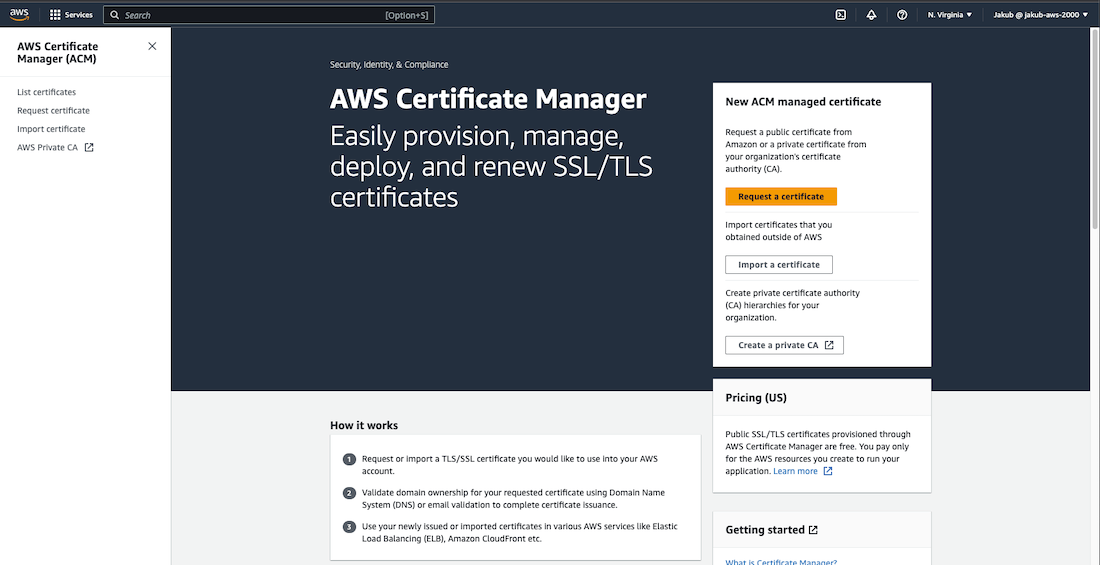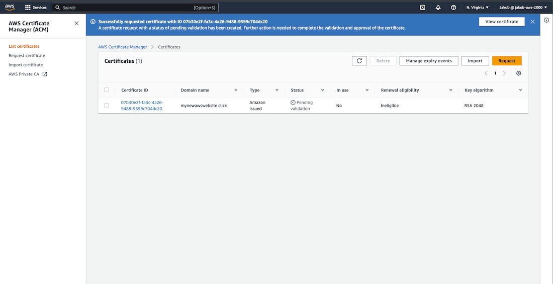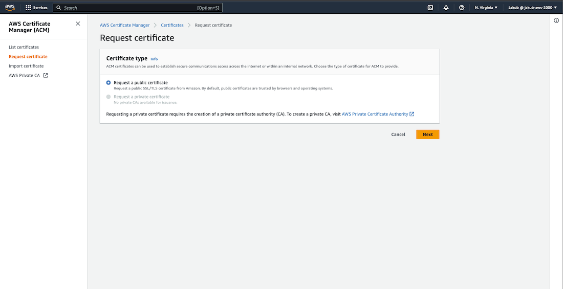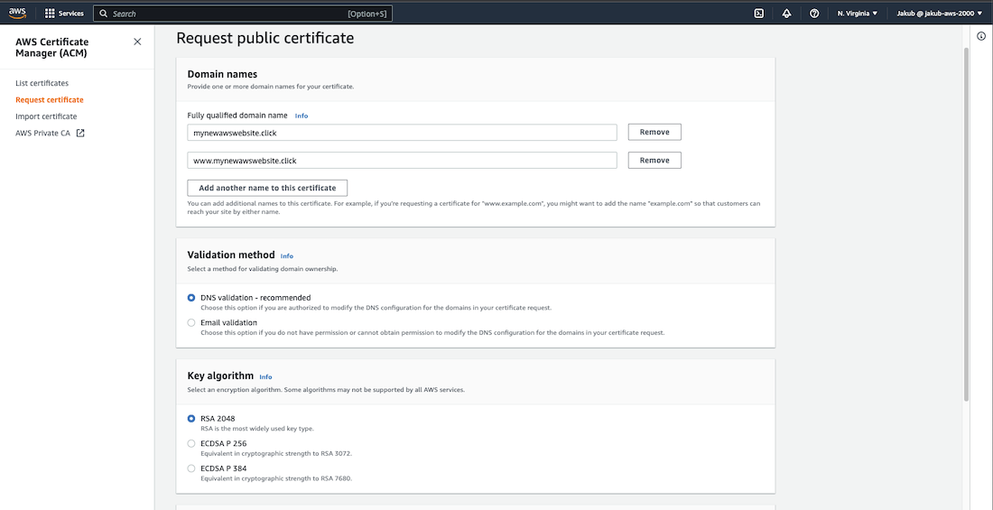 in the search bar. Next, click on Request a certificate and then click Next. In the Domain names section, enter the new domain and click Request at the bottom.