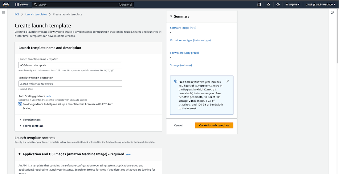 To create the Auto Scaling group, we need to provide a Launch Template. To do this, select the Launch Templates option from the left-hand side menu, and then click on Create launch template. Provide a name, check the Provide guidance to… box, and select the same settings we used when creating EC2 instances. Finally, click on Create launch template.