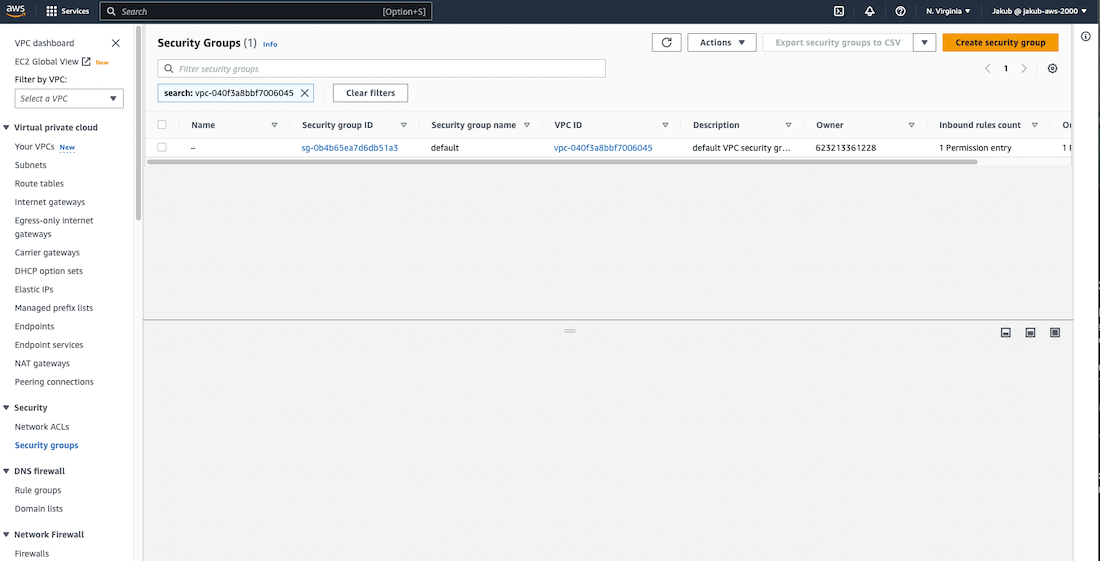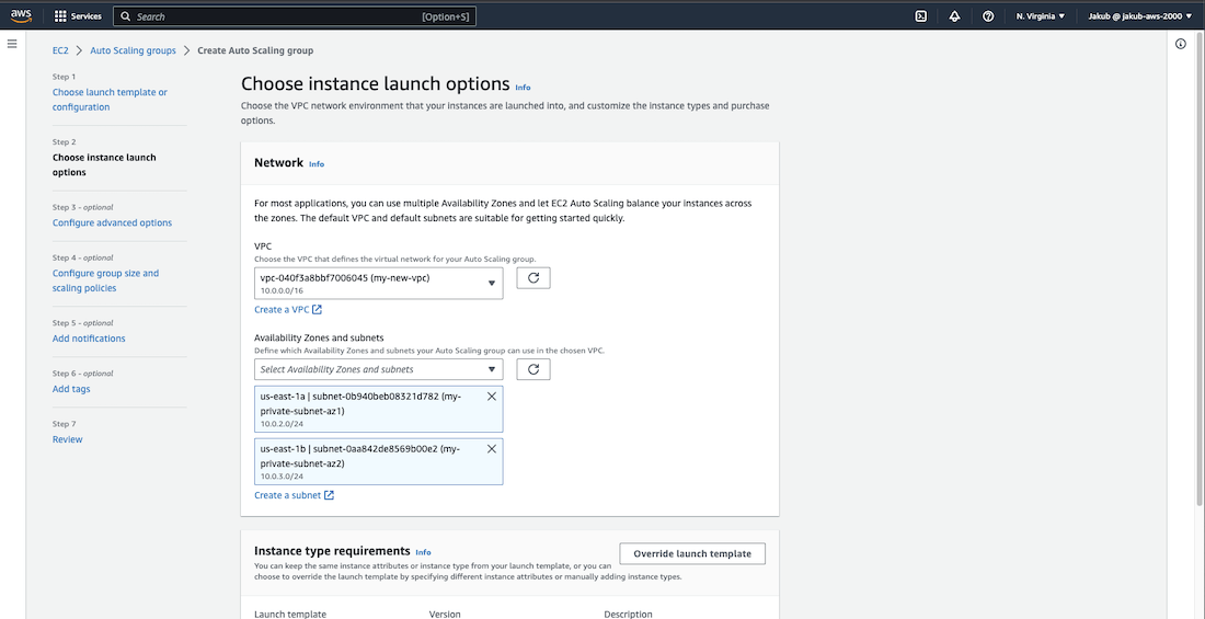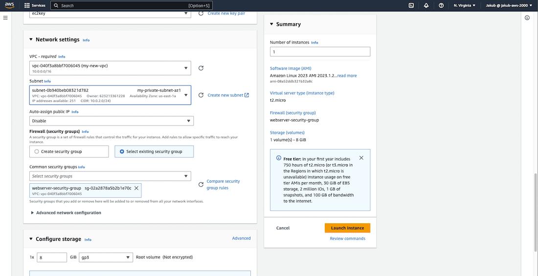 In the Network settings, select your VPC and the private subnet in AZ1. For the Firewall (security groups), choose Select existing security group and select security group created for EC2 from the drop-down menu.