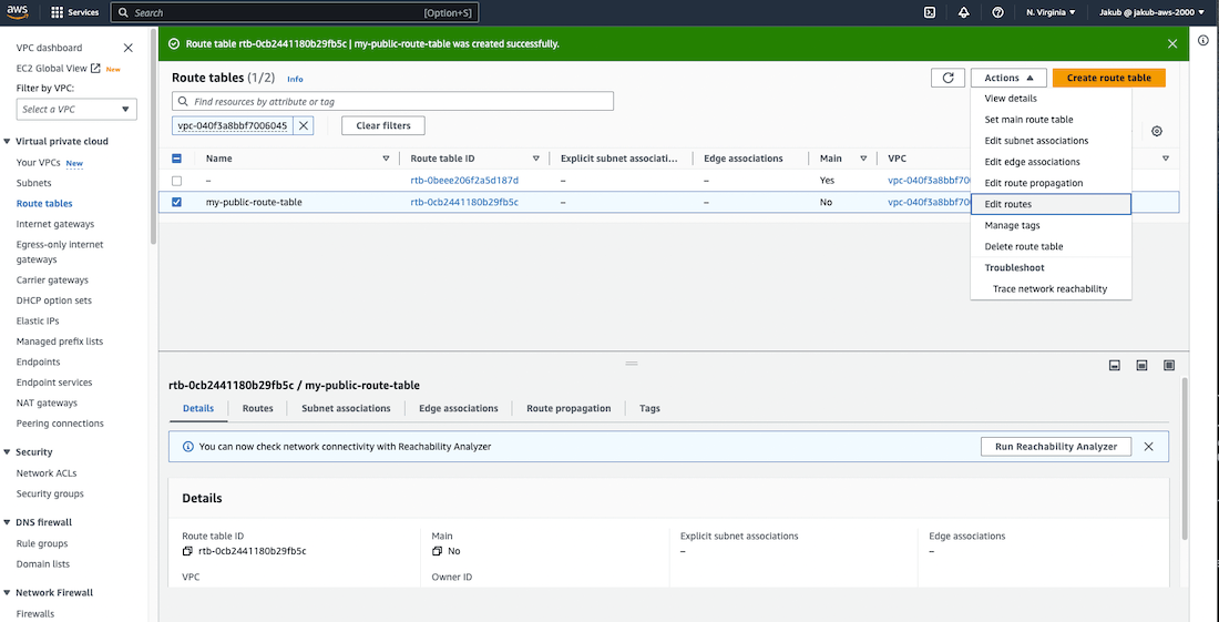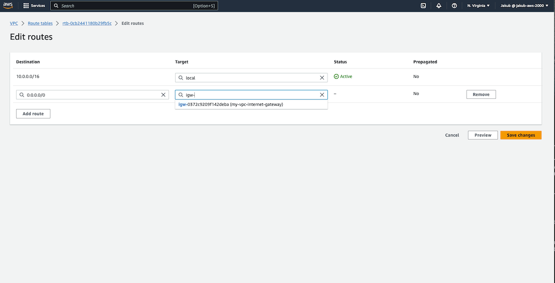 Next, we need to add a public route to the route table to direct traffic to the internet. To do this, select the newly created route table and click on Edit routes in the Actions drop-down menu. We need to allow traffic to and from the internet, so after clicking on Add route, the user must add 0.0.0.0/0 as the destination for the internet. Then, the user should search for the Internet gateway which facilitates communication between instances in the VPC and the internet and add it as the target. Finally, click on Save changes.