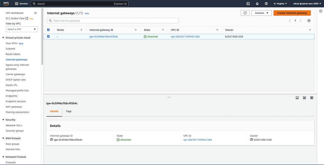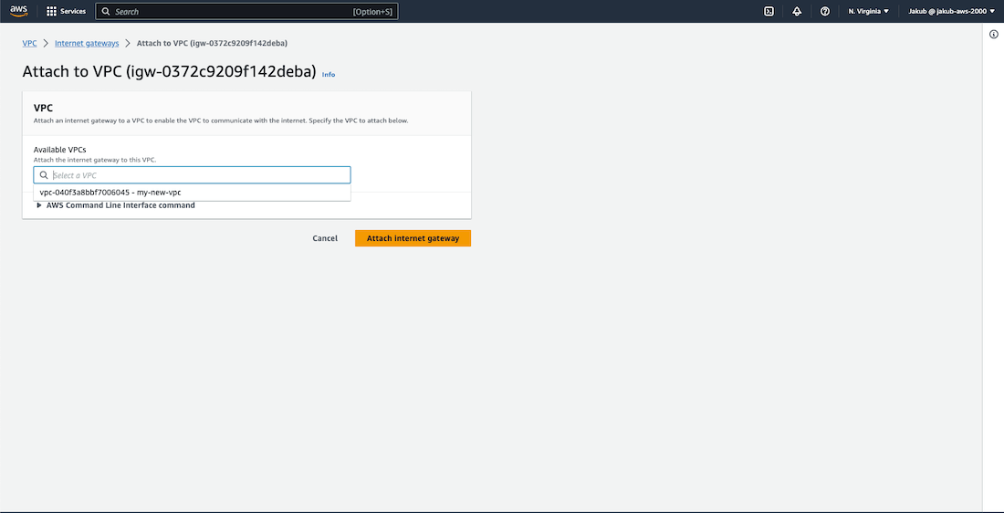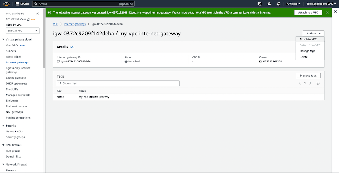 Now, we need to attach the Internet Gateway to our VPC for it to function properly. Click on Actions and select Attach to VPC. From the drop-down menu, select our VPC and confirm the settings by clicking on Attach Internet Gateway. That's it! We're done here, let's move on.