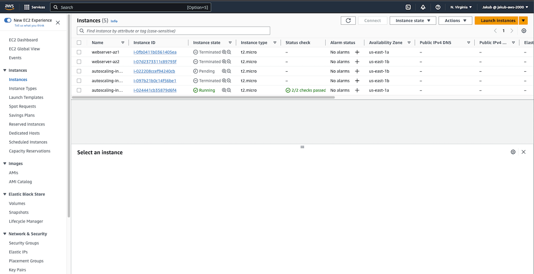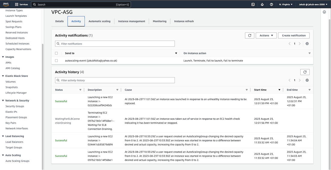 To ensure that our Auto Scaling Group (ASG) is properly configured, let's terminate three instances. Go back to EC2 service page, click on the Instances, select three instances, click on the Instance state at the top and select Terminate instance. After a few minutes, we should see that a new instance was created. We can also check our ASG activity by selecting our ASG and clicking on the Activity tab. Additionally, we should receive an email informing us about ASG activity.