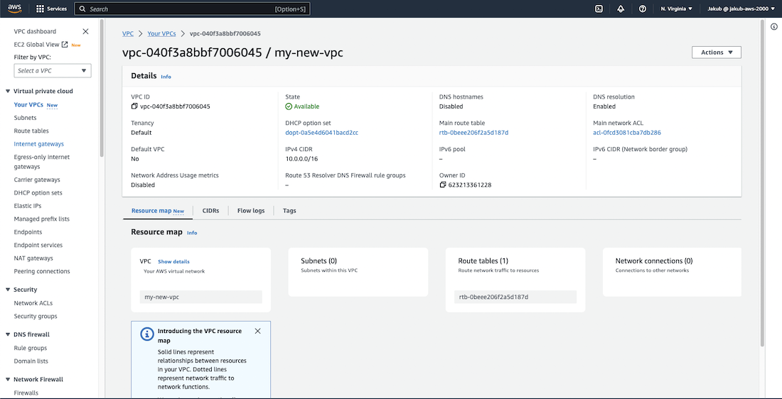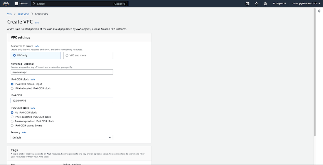 . In the VPC dashboard, click on Create VPC, pass the name and set the IPv4 CIDR to 10.0.0.0/16. Scroll down and click on Create VPC.
