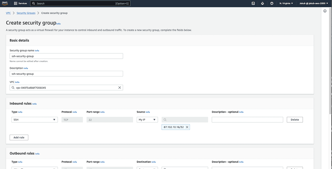 To create an SSH security group on Port 22, repeat the previous steps, but for the Type, select SSH. For the Source, select My IP. Scroll down and click on Create Security Group.