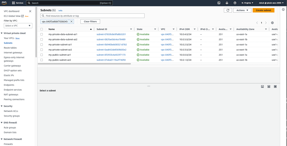 In the next step, we will create 4 private subnets. Two of them will be in us-east-1a AZ, with one subnet to hold EC2 and another subnet to hold our data, and the remaining two will be in us-east-1b AZ, which will be the same as in the first AZ.