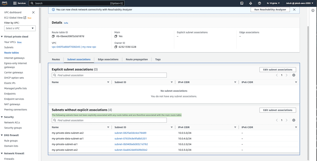 Although all six subnets may appear to be the same, the difference is that the first two subnets are public and have an association with the route that enables communication to and from the internet. The remaining four subnets are implicitly associated with the Main Route Table, which is private by default and has a route that routes traffic locally within the VPC. It doesn't have a route to the internet like our public route table.