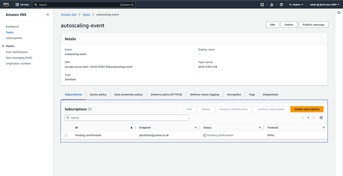 in the search bar and select appropriate service, then select Topics from the menu. Click on our topic to see that our subscription to this topic requires confirmation. Confirm it by clicking on the link inside the AWS email. After refreshing our topic page, we should see that our subscription is confirmed.