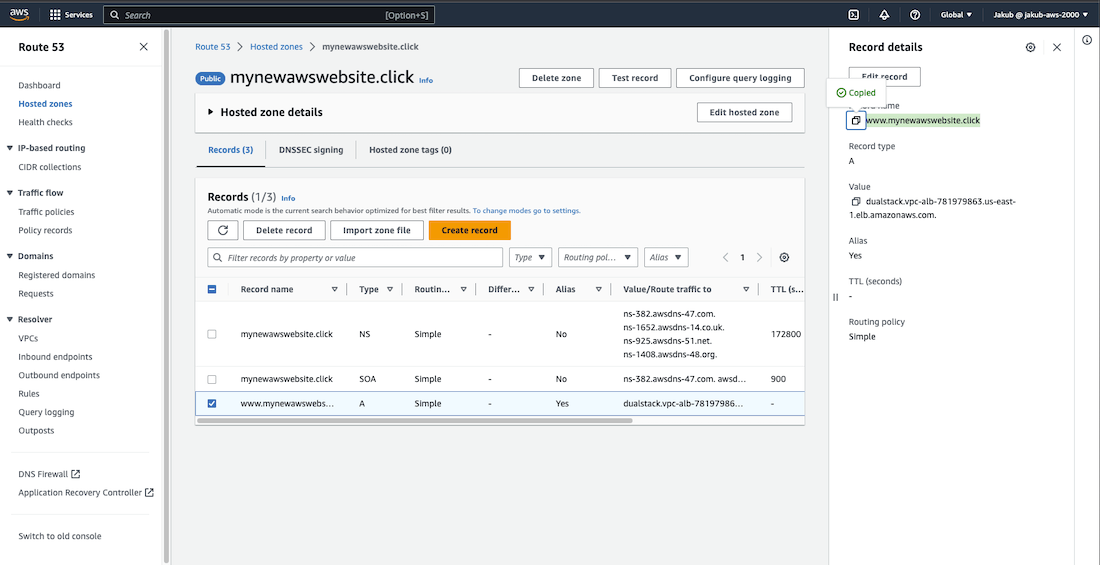 Once your domain is ready, create a record set to point your domain name to ALB. To do this, select Hosted zones on the left menu, then click on your domain name. Click Create record, then follow these steps:
