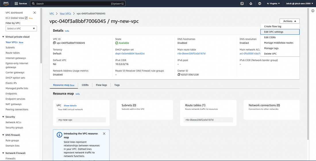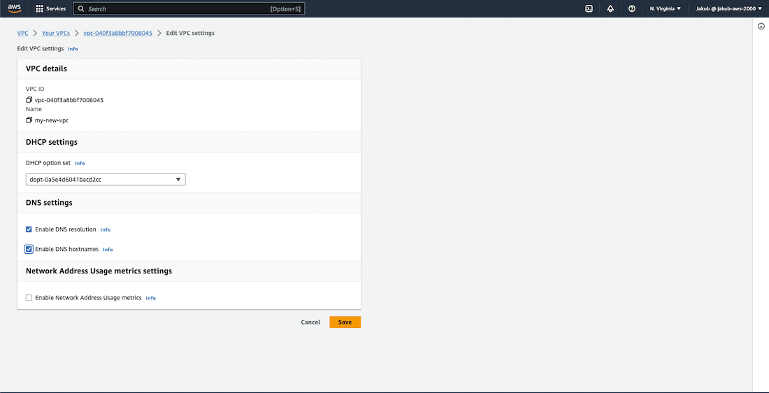 Next, we need to enable DNS hostnames for this VPC. Click on the Actions button located in the top-right corner and select Edit VPC settings from the list. On the following page, you'll see an option Enable DNS hostnames, tick the box and click on Save. By enabling this option, we'll be able to set up DNS in our VPC.