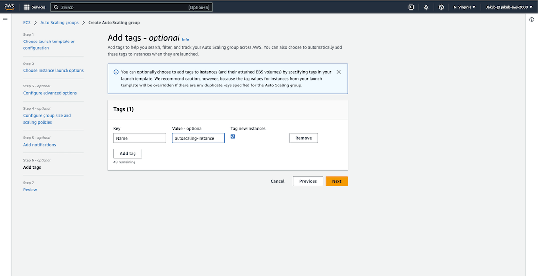 To make it easier to identify instances created by ASG, add a tag. Click Next. After reviewing all the details on the Review page, click on Create Auto Scaling Group. Now, if you select Instances from the left-hand menu, you should be able to view all your instances. You will see that half of them were created manually and the other half were created by your ASG.