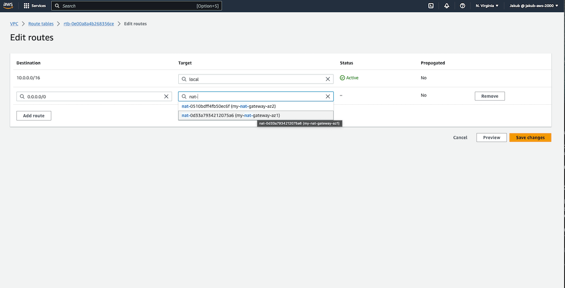With private route tables created, we are going to create a route for our private route table in AZ1 that will point to the NAT gateway in AZ1. To do this, select the private route table in AZ1, click on Routes and Edit routes. On the next screen, click on Add route and pass the IPv4 CIDR block for the internet traffic so 0.0.0.0/0, and select the NAT gateway created for AZ1 as the target. Click on Save changes. Repeat these steps to create a new route for our private route table in AZ2.