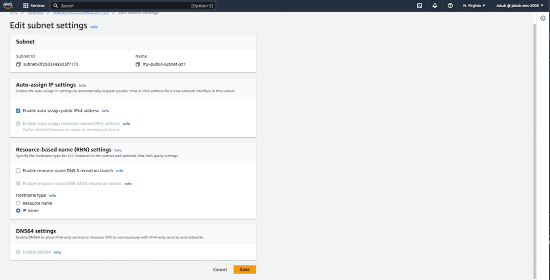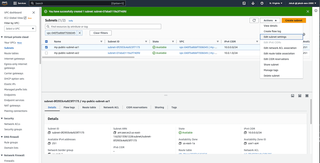 Once this is done, we need to enable auto-assign IP setting. To do this, choose one subnet, click on Actions, and select Edit subnet settings. Check Enable auto-assign public IPv4 address and save this setting. Repeat this action for the second subnet.