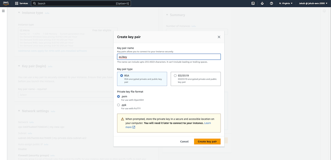 To create the second EC2 instance, repeat all the previous steps, but this time change the value for the tag, select the private subnet in AZ2 and choose the created key pair.