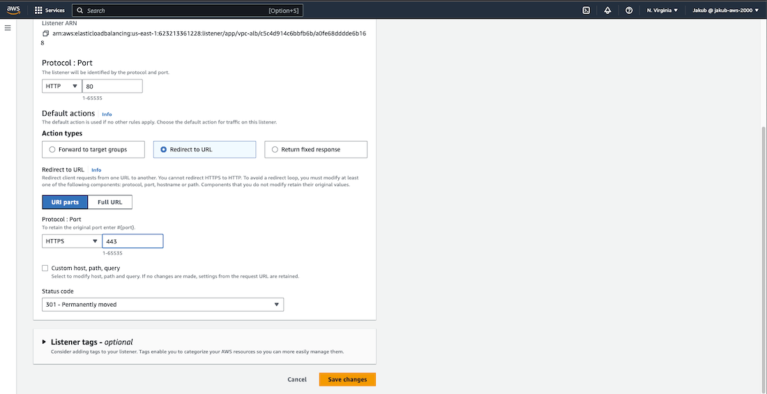 To ensure that only encrypted connections are allowed and users' data is protected, we need to forward traffic from HTTP to HTTPS. To do this, select the HTTP:80 listener and then click on Actions, and Edit listener. On the next page, change the action type to Redirect to URL and set the protocol and port as HTTPS and 443. Click Save changes to save your settings.